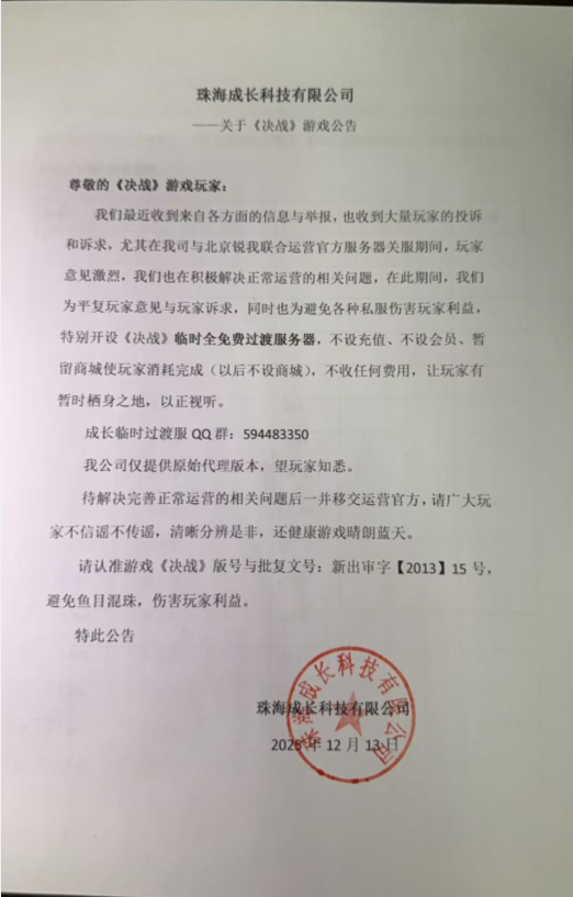 关于《决战》游戏公告